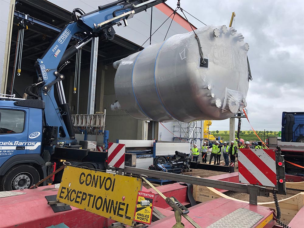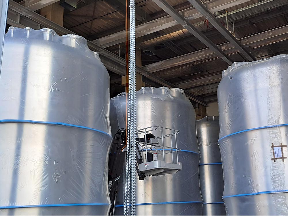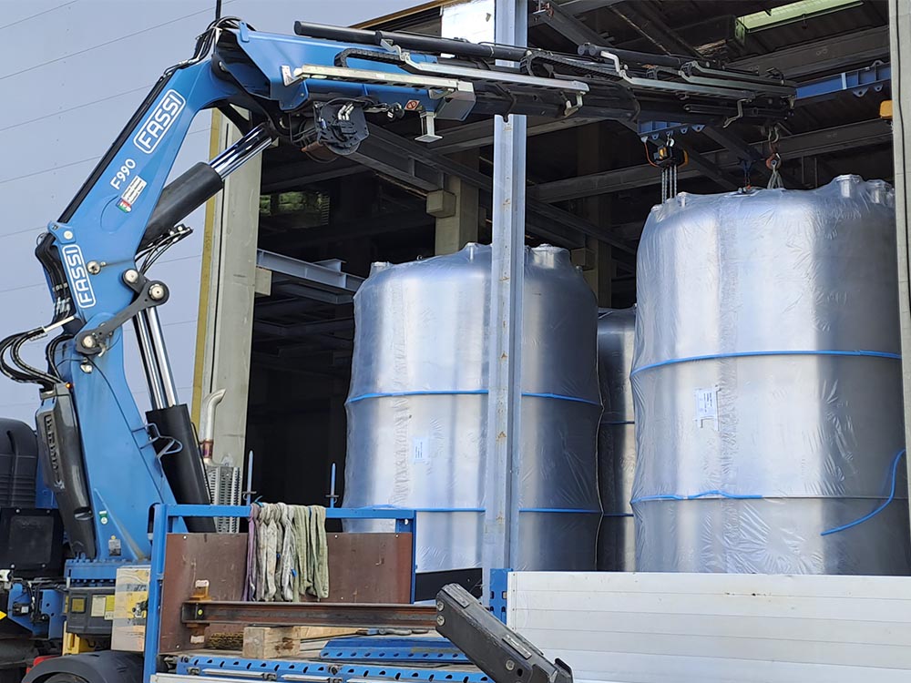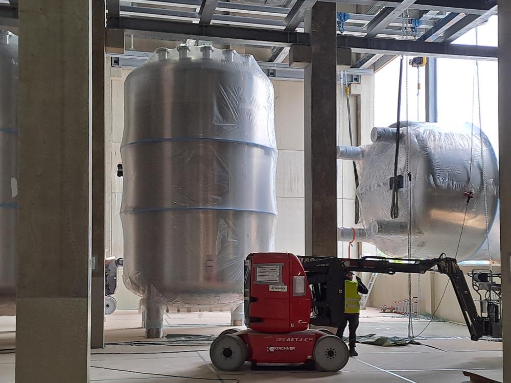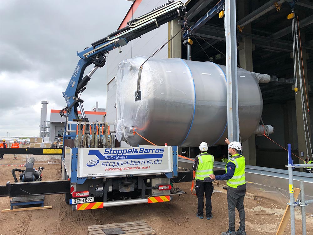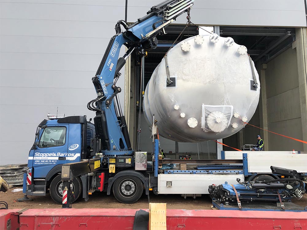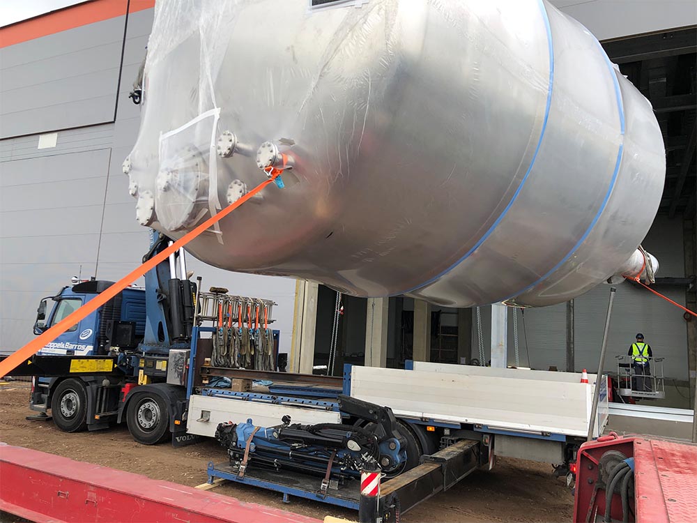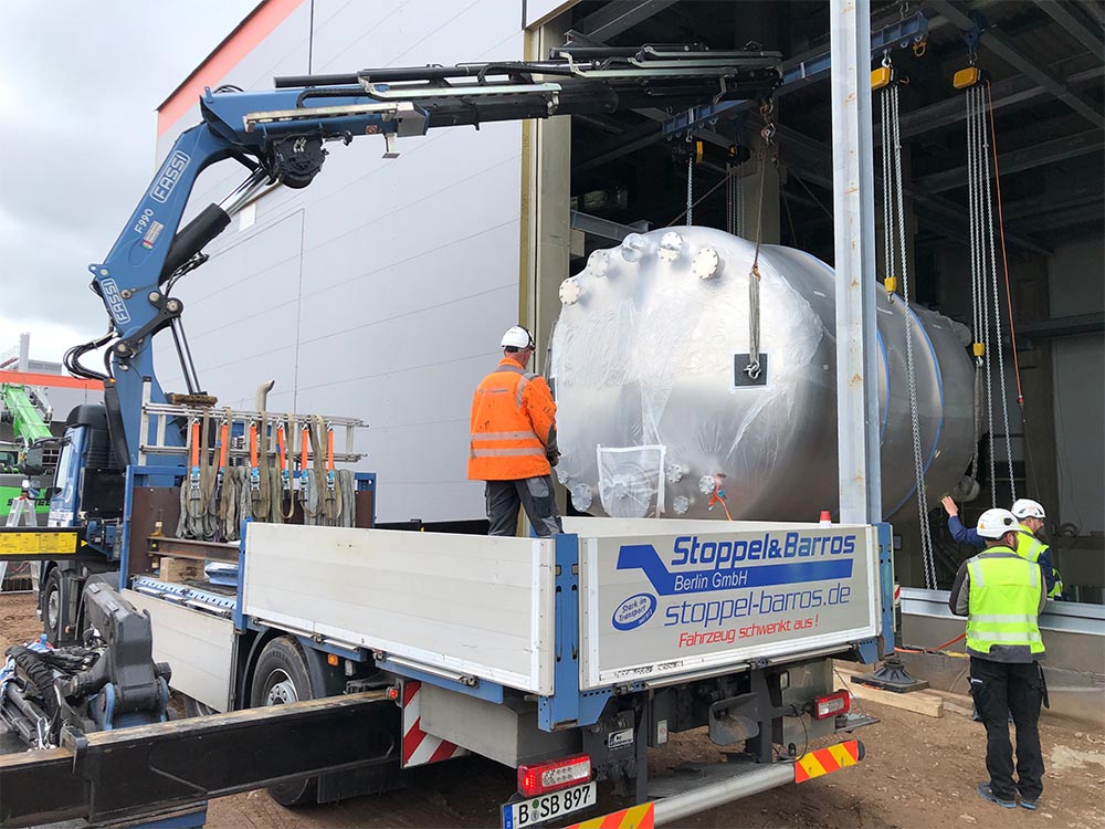 Entladung, Einbringung und Positionierung von 8 Lösemitteltanks aus Edelstahl mit jeweils 7,5 to. Gewicht in einem Fabrikneubau